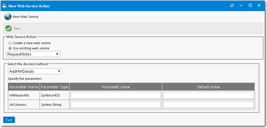 | Specify the parameters | Each parameter and expected object type is listed. App Portal can pass string and integer values to web services. More complex objects like datasets and arrays are not currently supported. Enter static values or variables for the Parameter Value. Enter static values for the Default Value in the case where the value is not available (a blank office value for example). If the web service requires the value and no default is specified an error may occur and prevent processing of the request. Please be careful to add defaults whenever possible. |