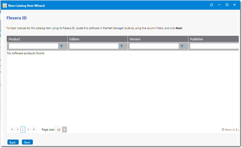 To track licenses for this catalog item using its Flexera ID, use the column filters to locate this application or package in FlexNet Manager Suite, select it, and click Next.