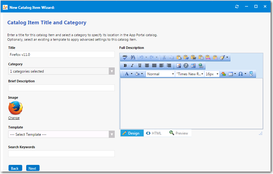 Title—The text entered in the Title field along with the catalog item icon, will be displayed when viewing this catalog item on the Browse Catalog tab.