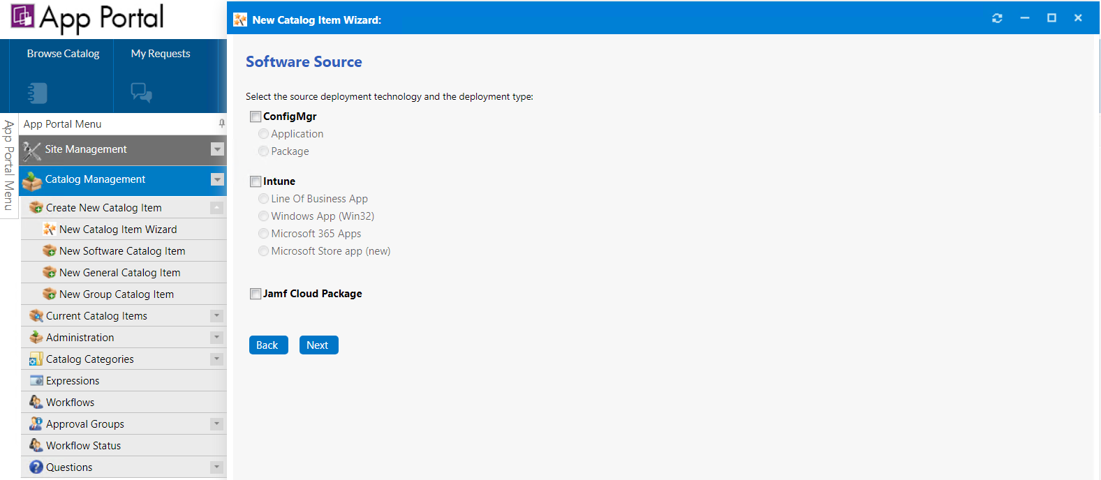 Select Software Catalog Item and click Next. The Software Source panel opens.