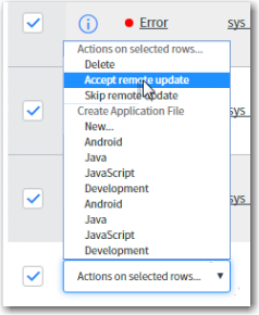 To resolve an error, select it, open the Actions on selected rows... menu at the bottom of the screen, and click Accept remote update.