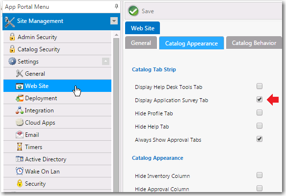 - Under Catalog Tab Strip, select Display Application Survey Tab.