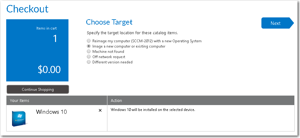 1. On the Browse Catalog tab, locate an OS deployment task sequence catalog item for the operating system you desire, and click Add to add it to your cart. The Choose Target panel of the Checkout Wizard opens.
