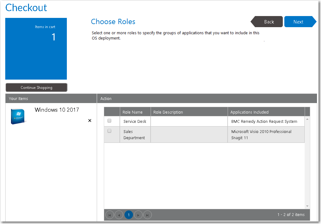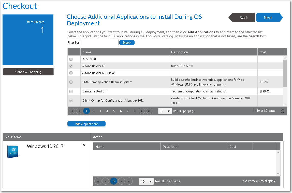 1. On the Browse Catalog tab, locate an OS deployment task sequence catalog item, and click Add to add it to your cart. The Choose Target panel of the Checkout Wizard opens.